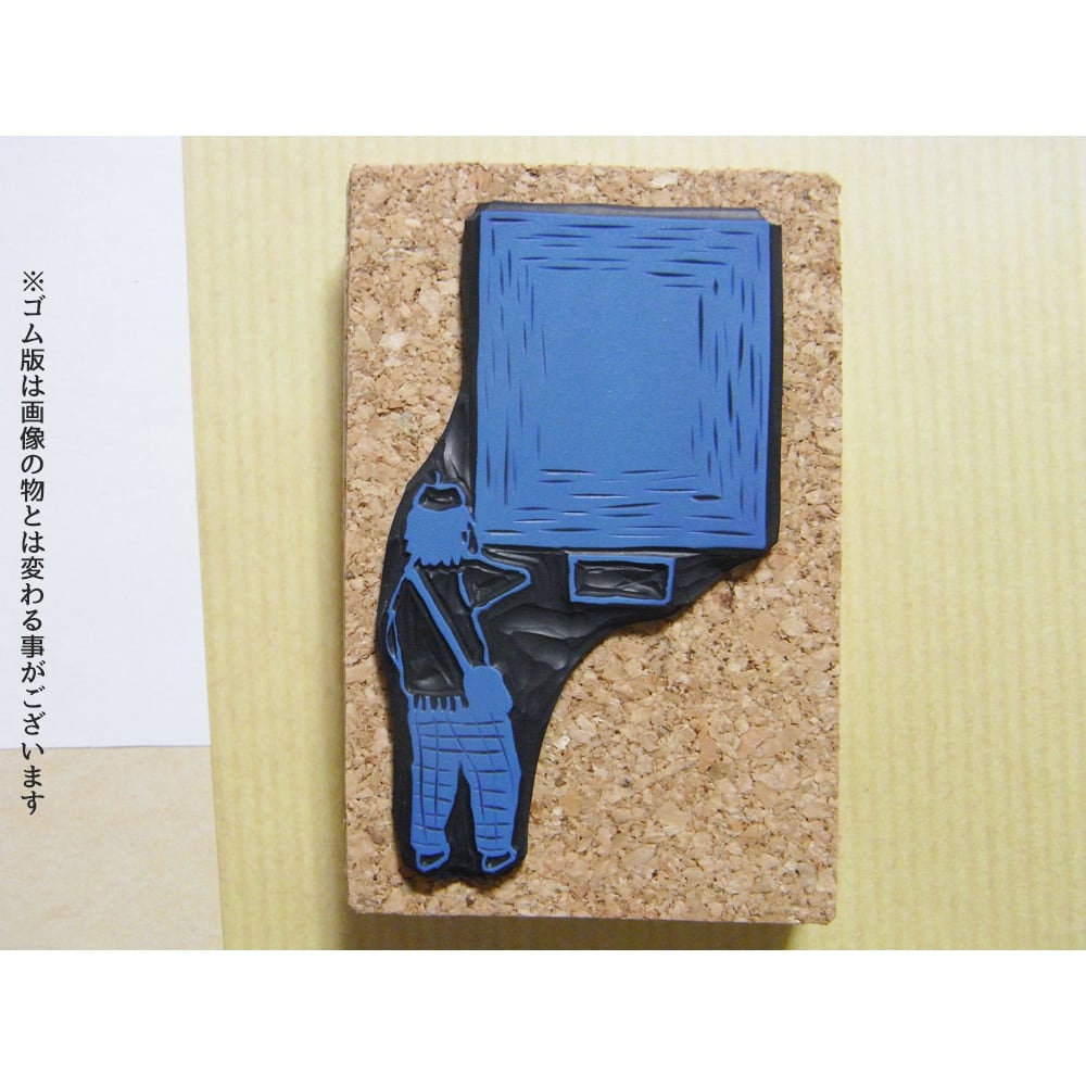 ベレー帽子のおじさんが展示をまじまじ眺めている切手枠はんこです。