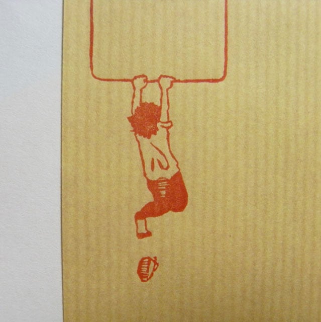 ぶら下がっている男の子の足から靴が脱げた切手枠はんこです。